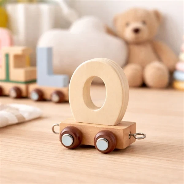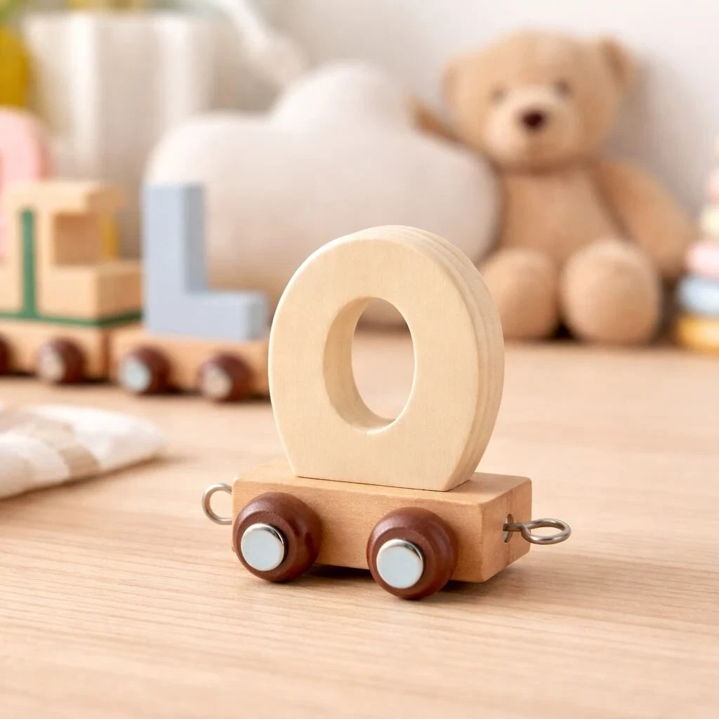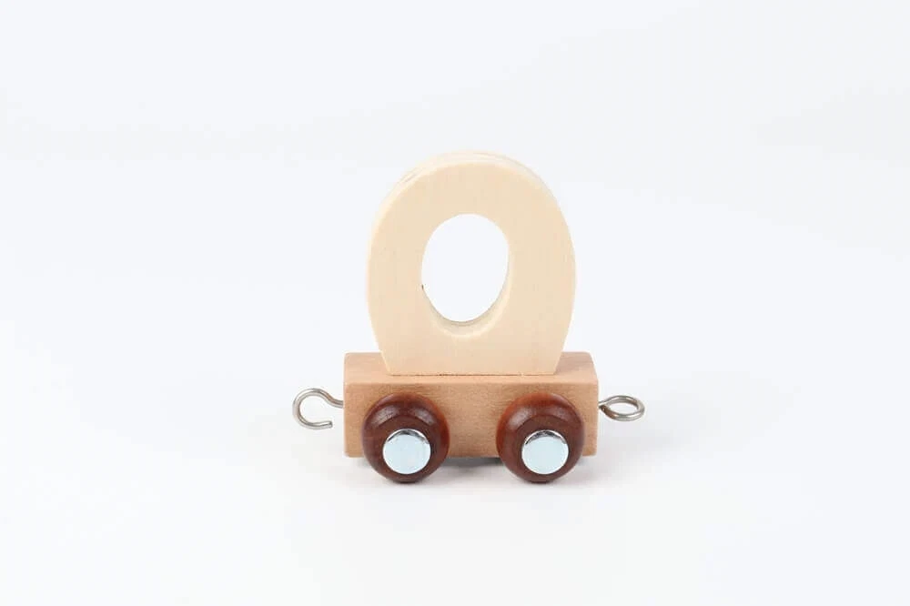 Navnetog bogstav O i naturtræ på togvogn placeret på gulv i hyggeligt børneværelseNavnetog bogstav O i naturtræ på togvogn omgivet af farverig pynt til børnefødselsdagNavnetog bogstav O i naturtræ med hjul og magnetkoblinger til personligt navnetog i træ