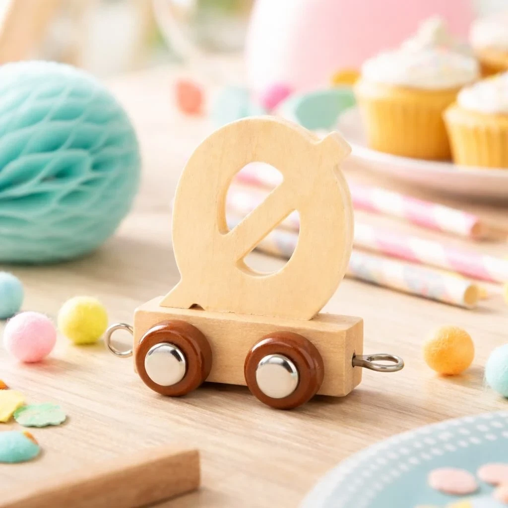 Naturfarvet navnetog bogstav Ø i træ på bord pyntet til børnefødselsdag med cupcakes og farverig dekorationNavnetog bogstav Ø i naturfarvet træ monteret på togvogn med hjul til personligt navnetog til børneværelseNaturfarvet navnetog bogstav Ø i træ på bord pyntet til børnefødselsdag med cupcakes og farverig dekoration