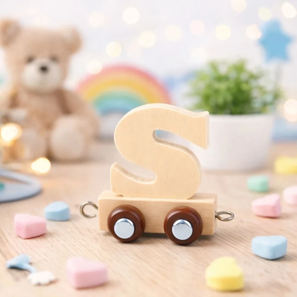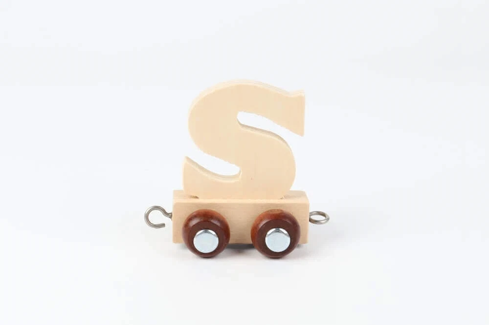 Navnetog bogstav S i naturtræ som trælegetøj på bord med bamse, regnbue og pastelfarvet pynt på børneværelseNavnetog bogstav S i naturtræ som trælegetøj på bord med cupcakes og pynt til børnefødselsdagNavnetog bogstav S i naturtræ som træ togvogn med hjul på hvid baggrund