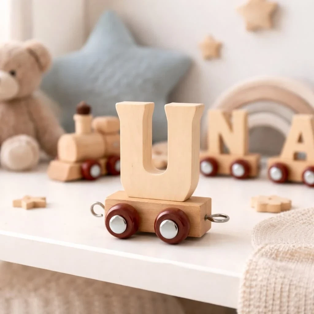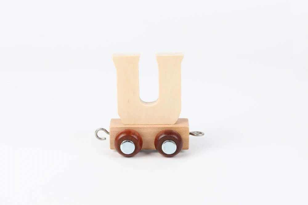 Navnetog bogstav U i naturtræ på togvogn dekoreret på hyggeligt børneværelseNavnetog bogstav U i naturtræ på togvogn omgivet af farverig pynt til børnefødselsdagNavnetog bogstav U i naturtræ monteret på togvogn med hjul