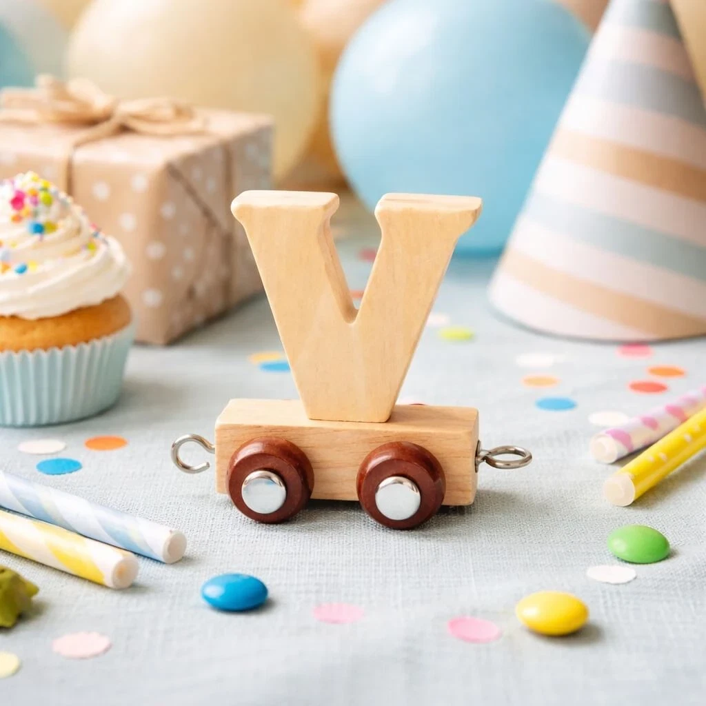 Navnetog bogstav V i naturtræ som dekorativ trævogn på hylde i lyst og nordisk børneværelseTræ navnetog bogstav V i naturtræ som dekoration til børnefødselsdag med farverigt pynt og legetøjNavnetog bogstav V i naturtræ som dekorativ trævogn på hylde i lyst og nordisk børneværelse