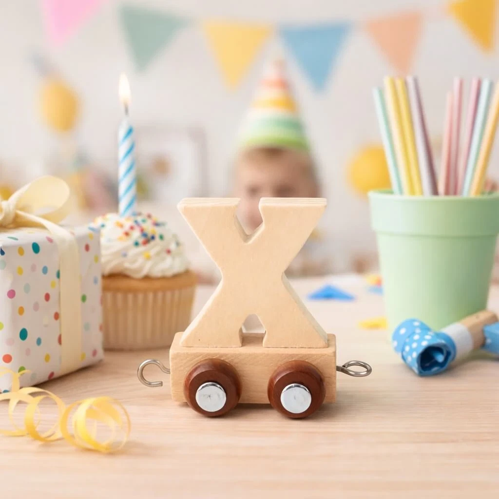 Navnetog bogstav X i naturtræ på træbord med bamse og regnbuelegetøj i baggrunden på børneværelseNavnetog bogstav X i naturtræ på bord til børnefødselsdag med cupcake, gave og farverig pynt i baggrundenNavnetog bogstav X i naturtræ på hjul med magnetkoblinger isoleret på hvid baggrund