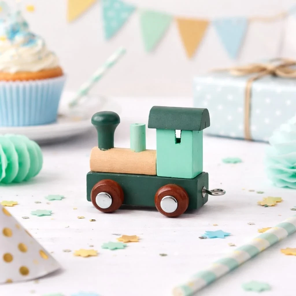 Arktisk blåt navnetog lokomotiv i træ som dekorativt og personligt legetøj til børneværelsetArktisk blåt navnetog lokomotiv i træ på pyntet fødselsdagsbord med gave og cupcakesArktisk blåt navnetog lokomotiv i træ med magneter til personligt bogstavtog til børn