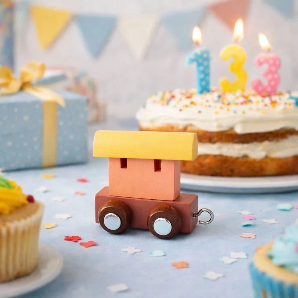 Navnetog togvogn Arctic Sunrise i træ med varme farver på børneværelset som del af personligt bogstavtogNavnetog togvogn Arctic Sunrise i træ på fødselsdagsbord med lagkage, lys og festpyntNavnetog togvogn Arctic Sunrise i varme solopgangsfarver som del af personligt bogstavtog i træ til børn
