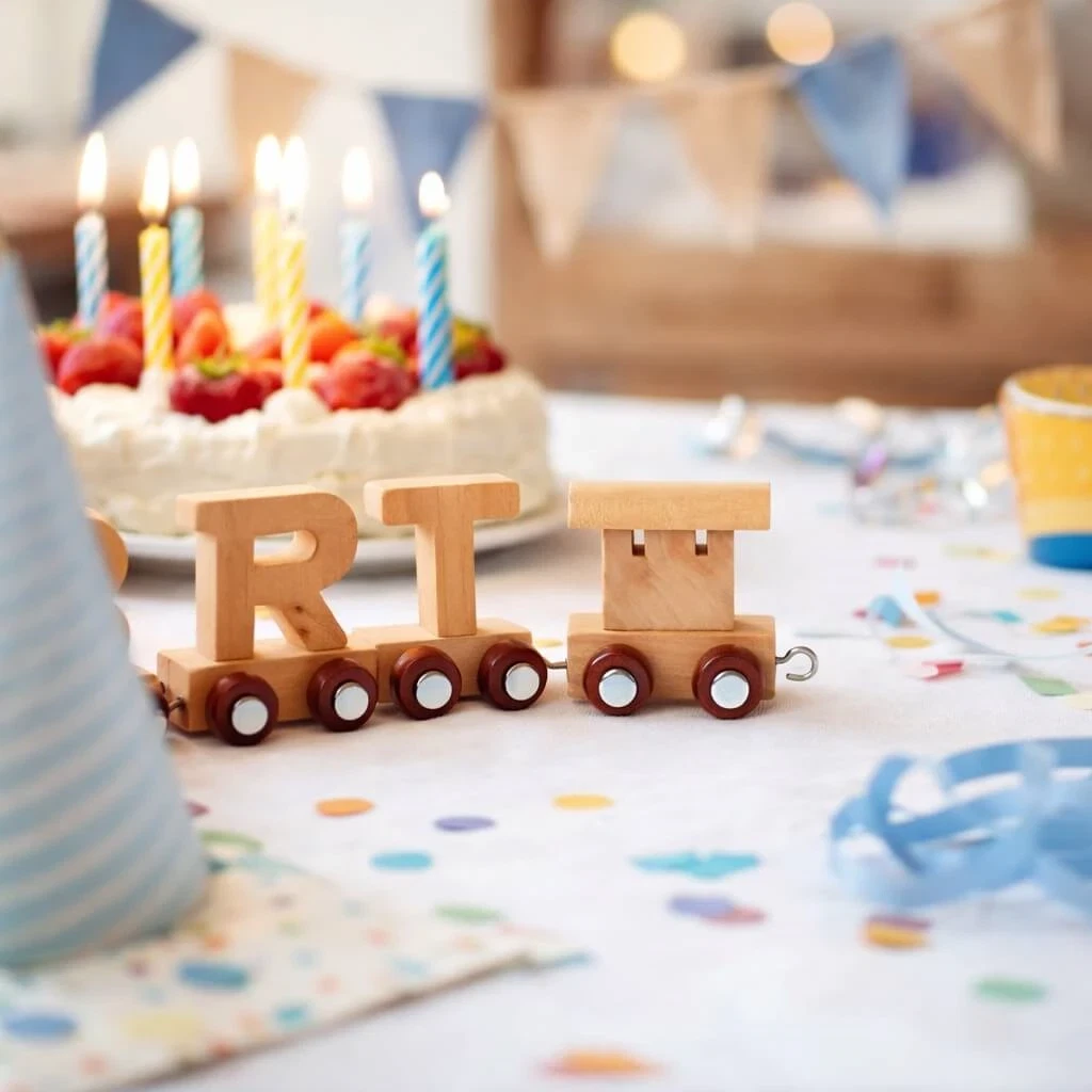 Togvogn i naturtræ til navnetog foran bogstavtog på børneværelseNavnetog i naturtræ på fødselsdagsbord med kage og lysNavnetog togvogn i naturtræ til personligt trætog med magnetkobling