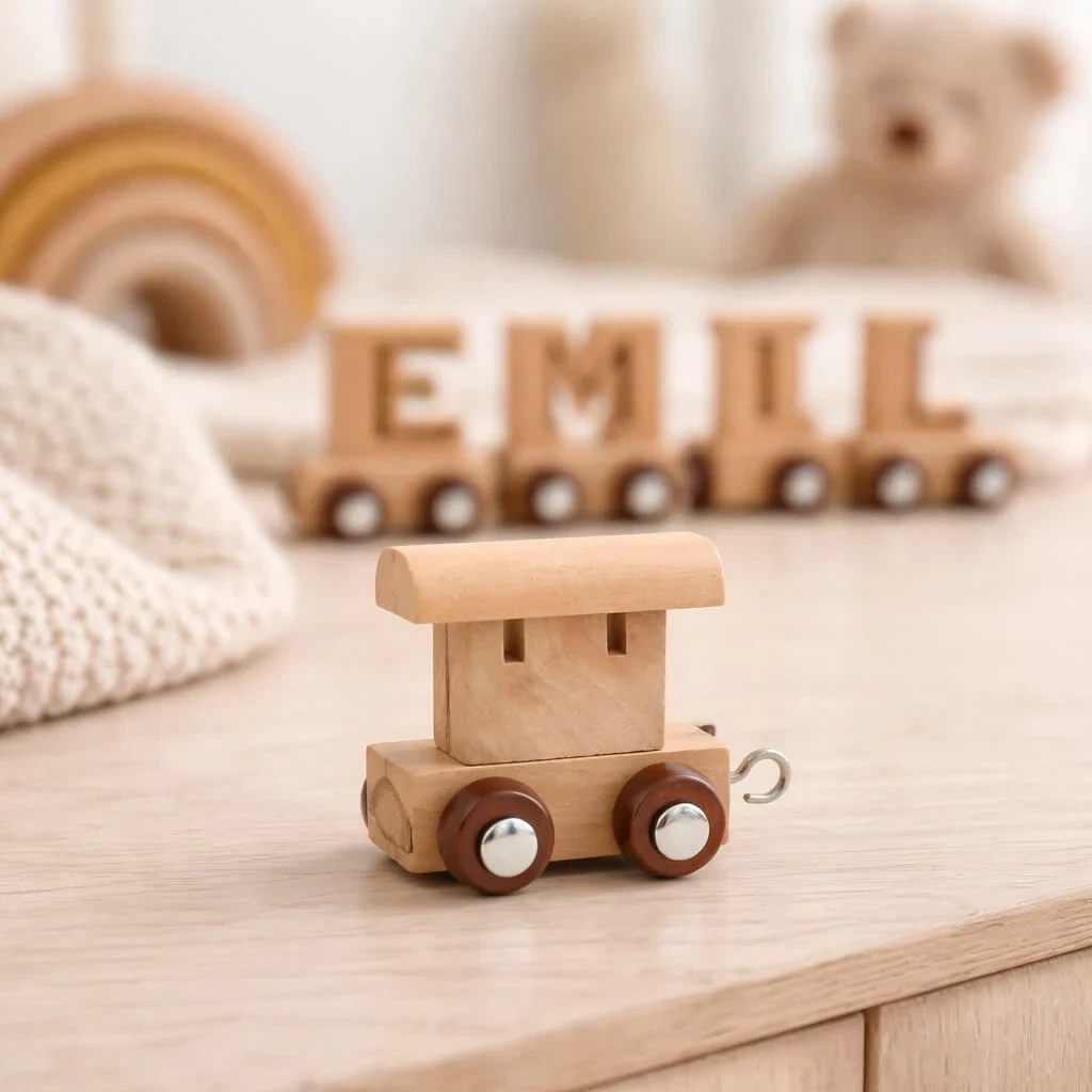 Et navnetog i træ er både legetøj og minde. Det understøtter barnets nysgerrighed for bogstaver og navnegenkendelse, samtidig med at det fungerer som personlig pynt på børneværelset. Denne togvogn er derfor en oplagt gaveidé til dåb, navngivning, barselsbesøg eller fødselsdag.