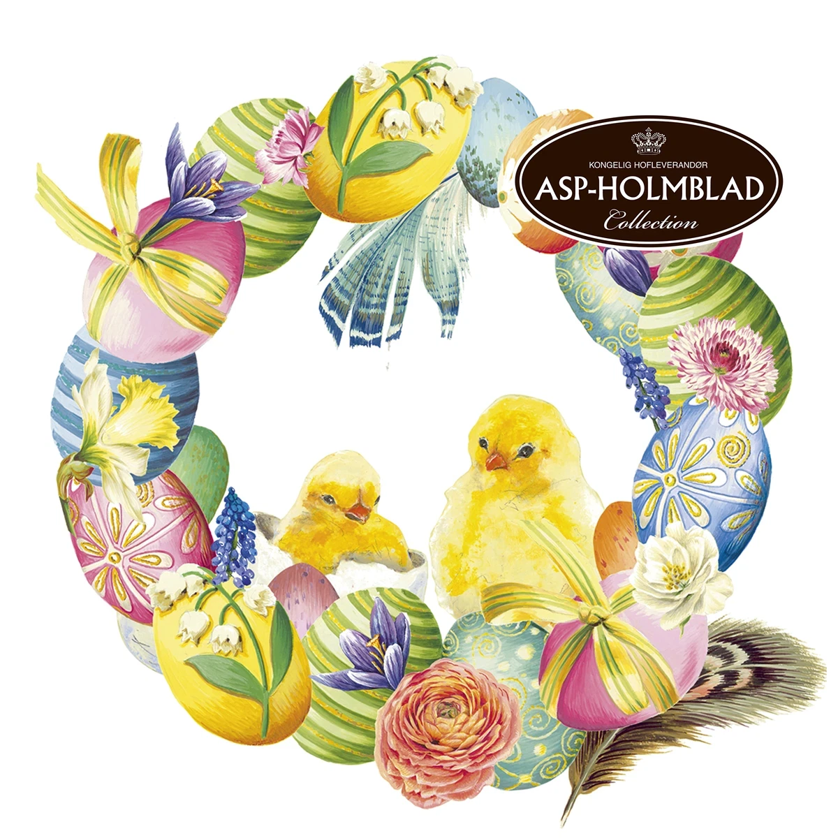 Skab en helt særlig påskestemning med denne smukke serviet med en dekorativ påskekrans. Motivet består af farverige, kunstnerisk dekorerede æg, fine blomster og to nuttede kyllinger i midten – et design der emmer af forår, hygge og tradition.