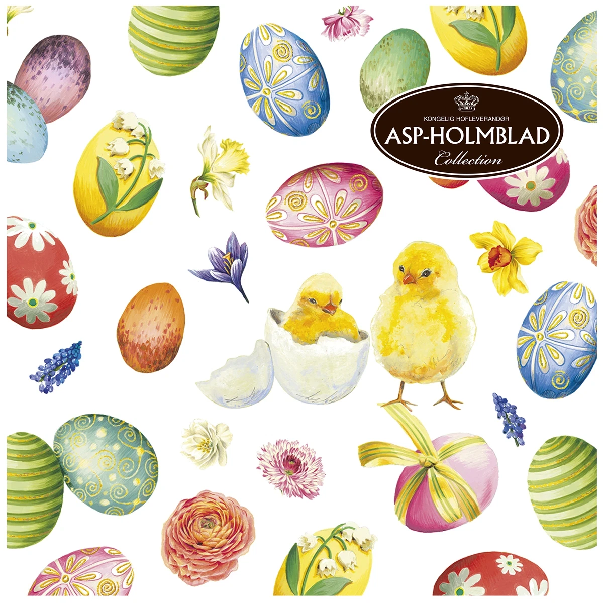 Gør dit påskebord ekstra festligt med disse smukke servietter med et farverigt og detaljeret design. Motivet kombinerer søde kyllinger, dekorative påskeæg og fine blomster, som tilsammen skaber en glad og forårsfrisk stemning.