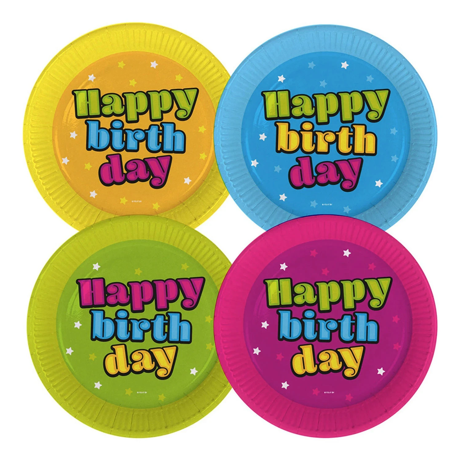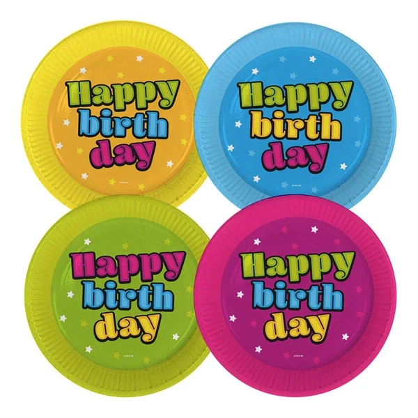 Disse festlige paptallerkner er perfekte til enhver fødselsdagsfest, og skaber farverig og munter stemning. Med et iøjnefaldende "Happy Birthday" print er disse tallerkner festlig blikfang på festbordet.
