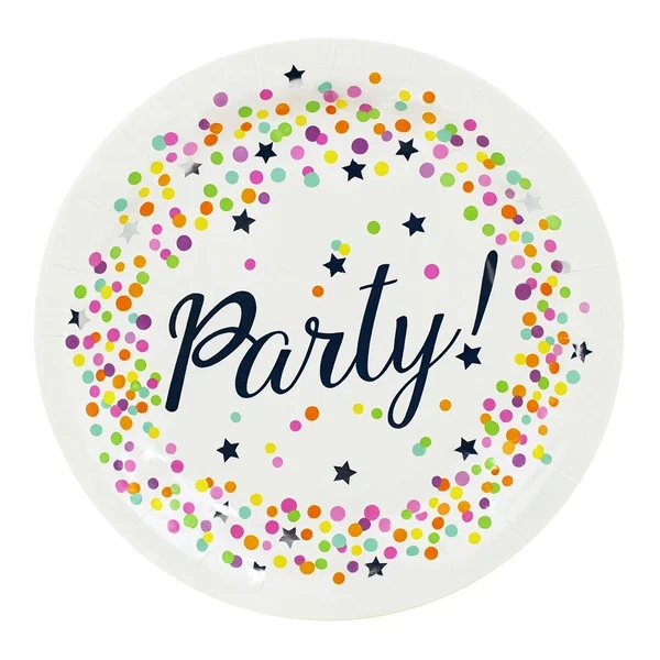 Skru op for feststemningen til din næste fest med disse flotte paptallerkner. Hver tallerken har print af farverig konfetti og teksten "Party", som gør dem ideelle til fødselsdag, jubilæer og andre fejringer, hvor der skal skabes en sjov og uformel stemningen.