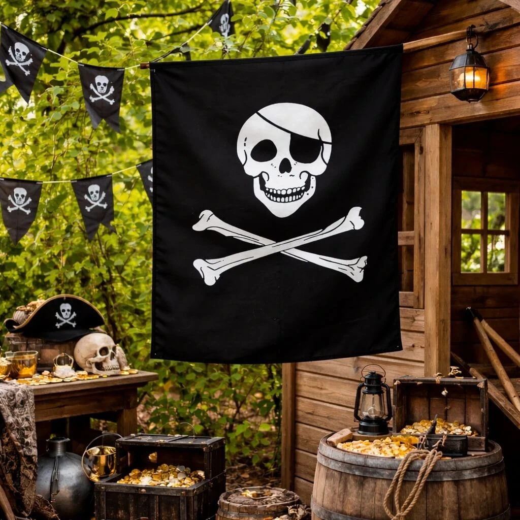 Hæng flaget op ved indgangen, i haven eller bag kagebordet, og lad børnene træde ind i en verden af pirater, skattekister og eventyr.