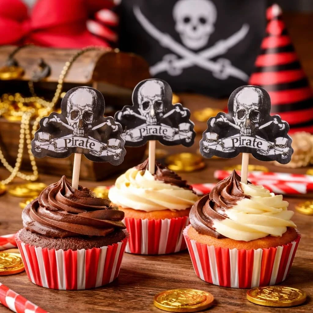 Gør din fest til et ægte eventyr med pirat kagepynt 24 stk, der hurtigt og nemt forvandler cupcakes og kager til en imponerende piratfest.