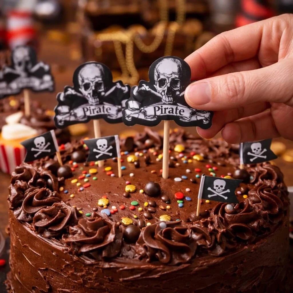 Med klassiske piratmotiver som dødningehoveder, piratflag og skattekister skaber du en gennemført feststemning på få sekunder – uden avanceret kagedekoration.