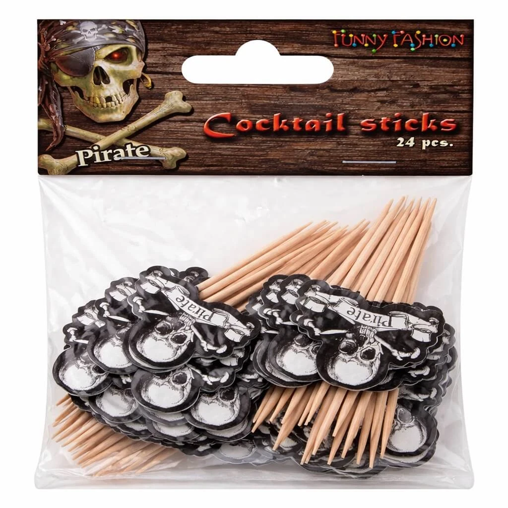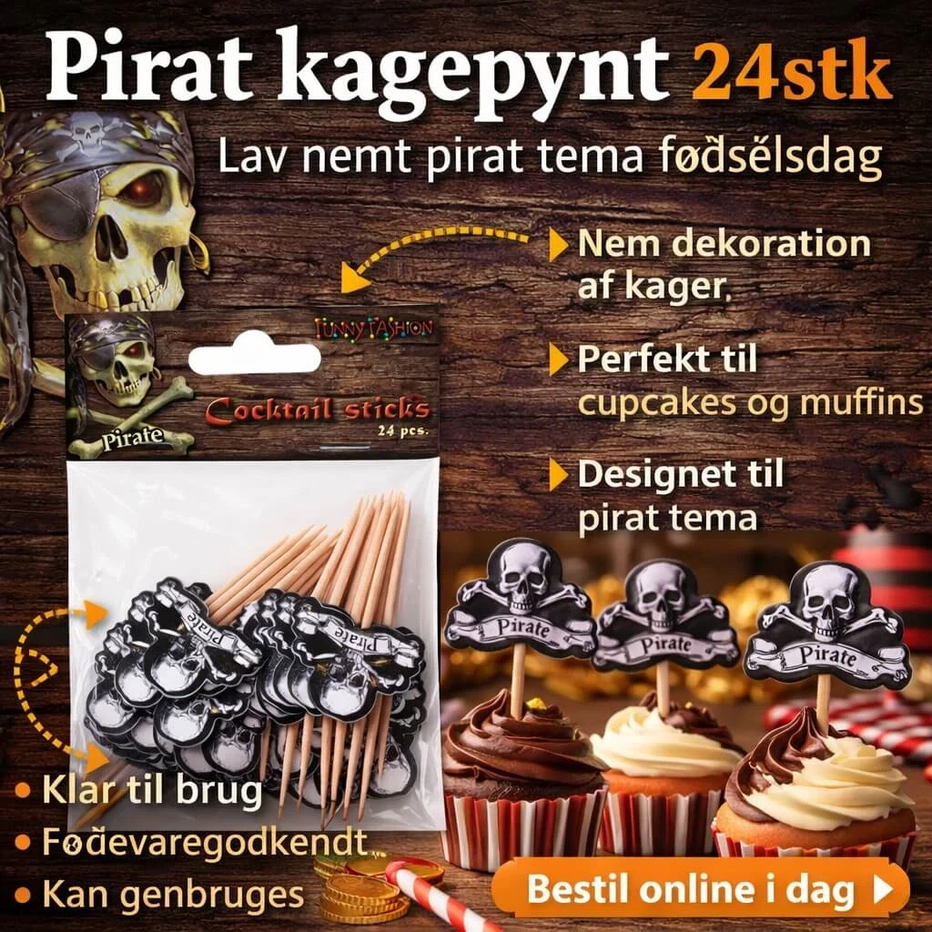 Pirat kagepynt 24 stk i emballage med cocktail sticks og dødningehoved cupcake toppersPirat cupcakes med pirat kagepynt til børnefødselsdag med pirat tema og fest dekorationPirat kagepynt 24 stk brugt på chokoladekage til børnefødselsdag med pirat temaClose-up af pirat kagepynt med dødningehoved på cupcake til pirat børnefødselsdagInfografik med pirat kagepynt 24 stk til cupcakes og børnefødselsdag med pirat tema