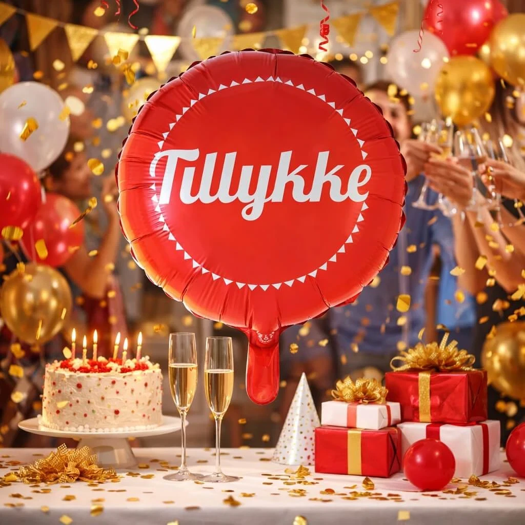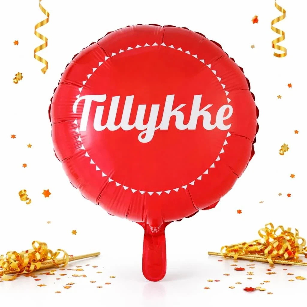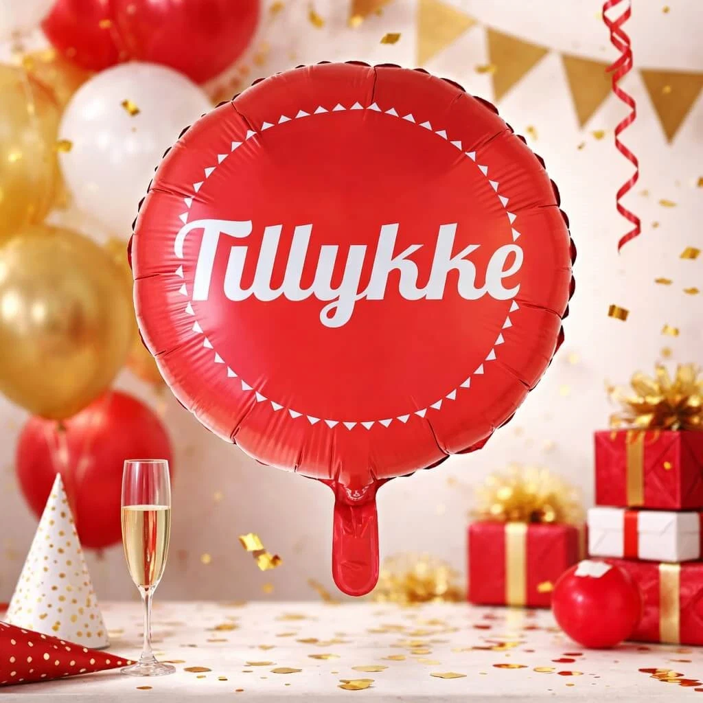 Flot metallic rød farve med hvid "Tillykke" tekst