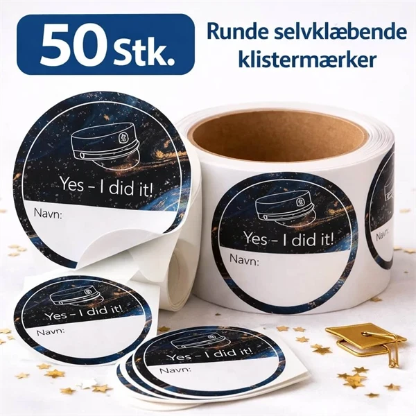 Rulle med 50 runde selvklæbende studenter klistermærker – perfekt til fest & pynt