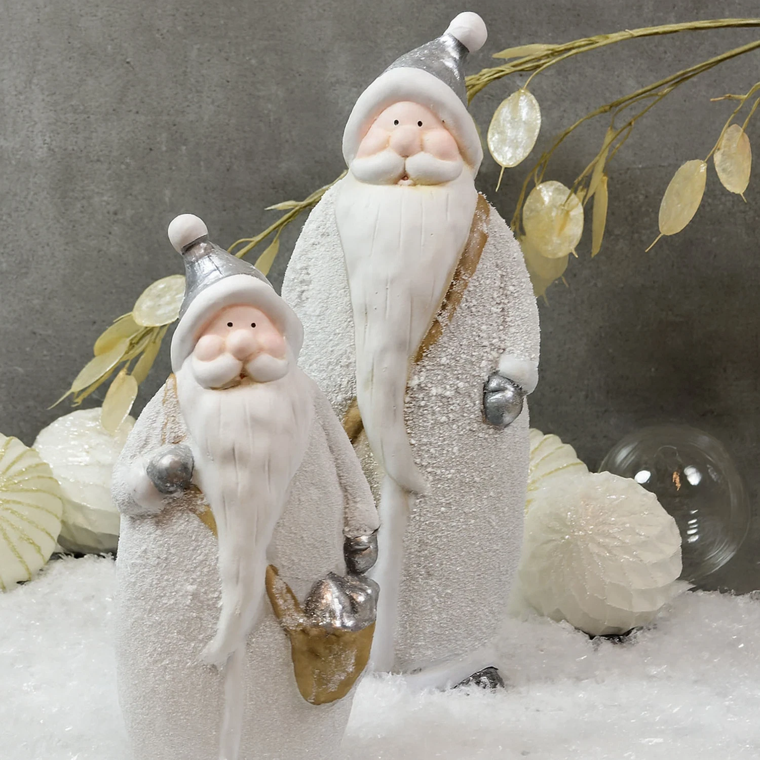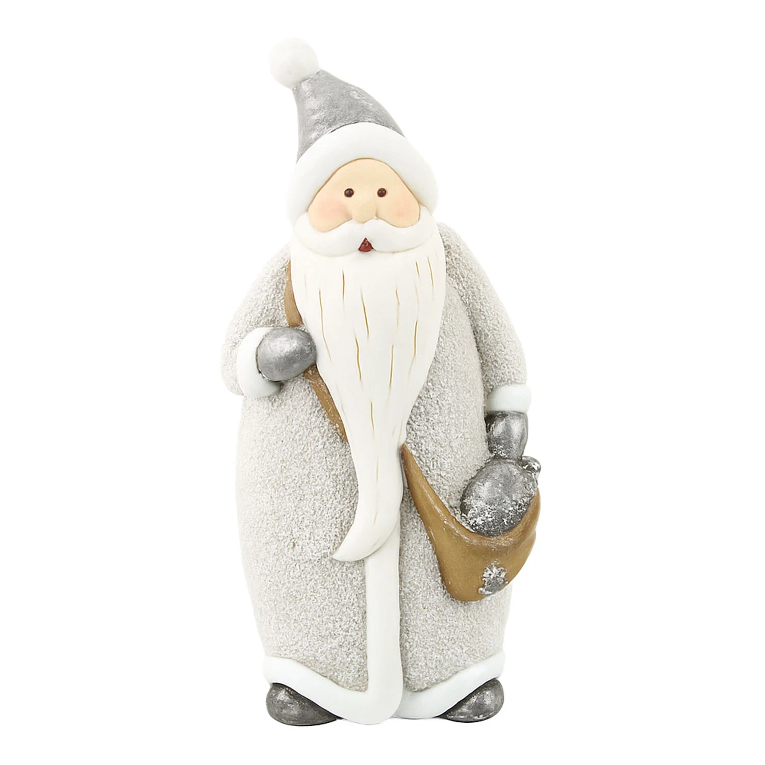 Kom i julestemning med denne fine julemand, som er på vej ud med gaver. Er fint dekoreret med sne på den lange frakke og et par enkelt sølvglimmer julegaverne, så den har et ekstra fint look.