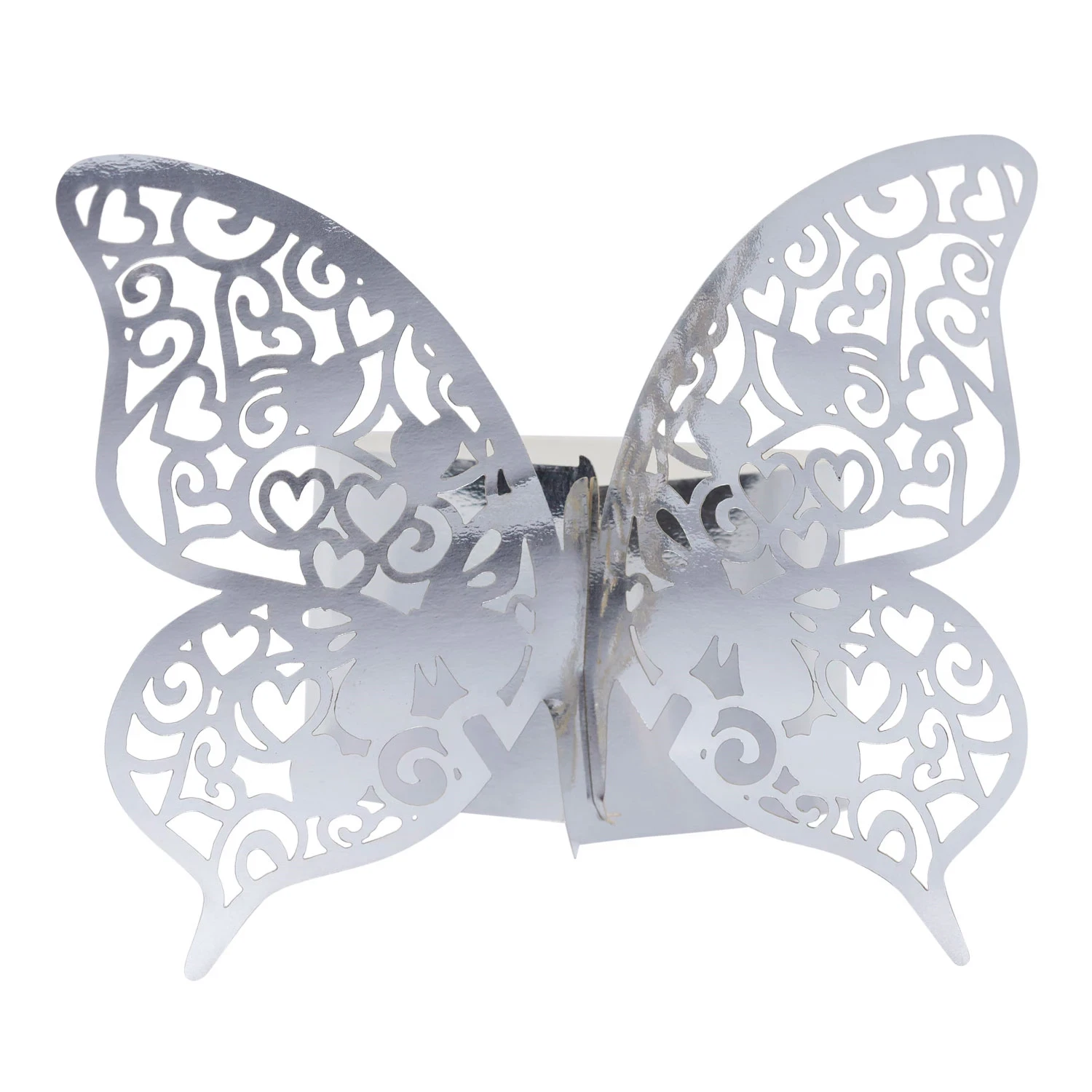 Løft den flotte borddækning et niveau op med disse smukke servietringe med sommerfugle i sølv med metallisk finish. De flotte udskæringer i vingerne med hjerter og sommerfugle giver servietringene et let og luftigt udtryk. Der er 10 styk i en pakke – bestil i dag!