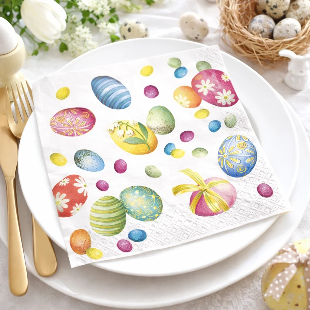 Gør dit påskebord ekstra festligt med disse smukke og farverige servietter med dekorative påskeæg i flotte mønstre. De livlige farver og fine detaljer skaber en glad og indbydende stemning, som passer perfekt til både påskefrokost, brunch og forårets hyggelige stunder.