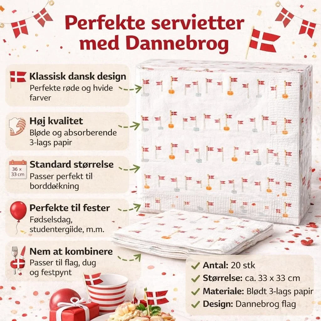 Servietter med Dannebrog 20 stk i klassisk dansk design – perfekte til fødselsdag og festServietter med Dannebrog brugt til borddækning med dansk festtema til fødselsdag og studentServietter med Dannebrog 20 stk vist på festbord med dansk borddækning og dekorationServietter med Dannebrog foldet i glas til dansk borddækning ved fødselsdag og festInfografik af servietter med Dannebrog 20 stk med produktinformation og fordele til dansk fest og borddækning
