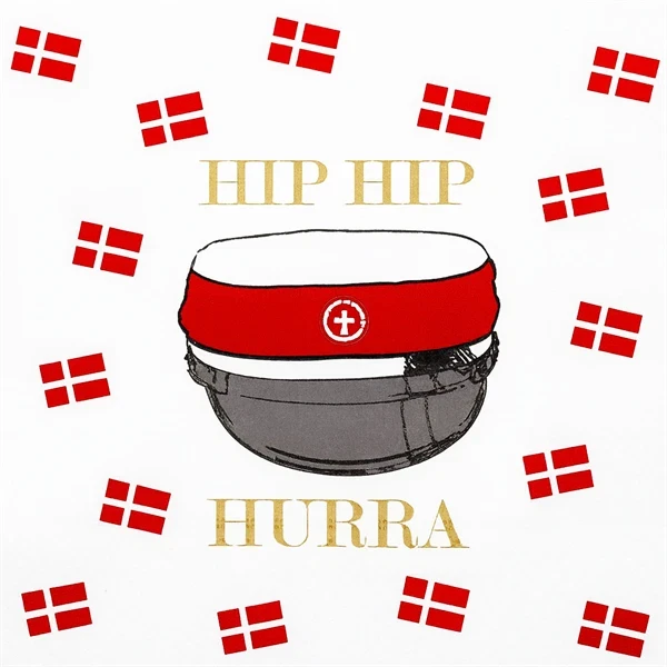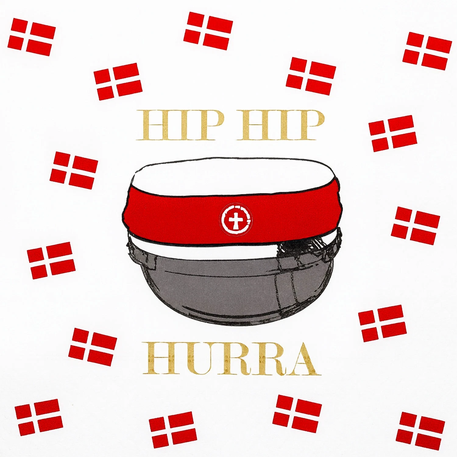 En hvid serviet med en rød studenterhue og røde og hvide Dannebrogsflag – det matcher bare helt perfekt. Derudover er servietten dekoreret med ordene HIP HIP HURRA. Og hvad andet kan du sige til en nyudklækket student?