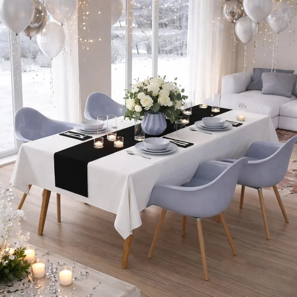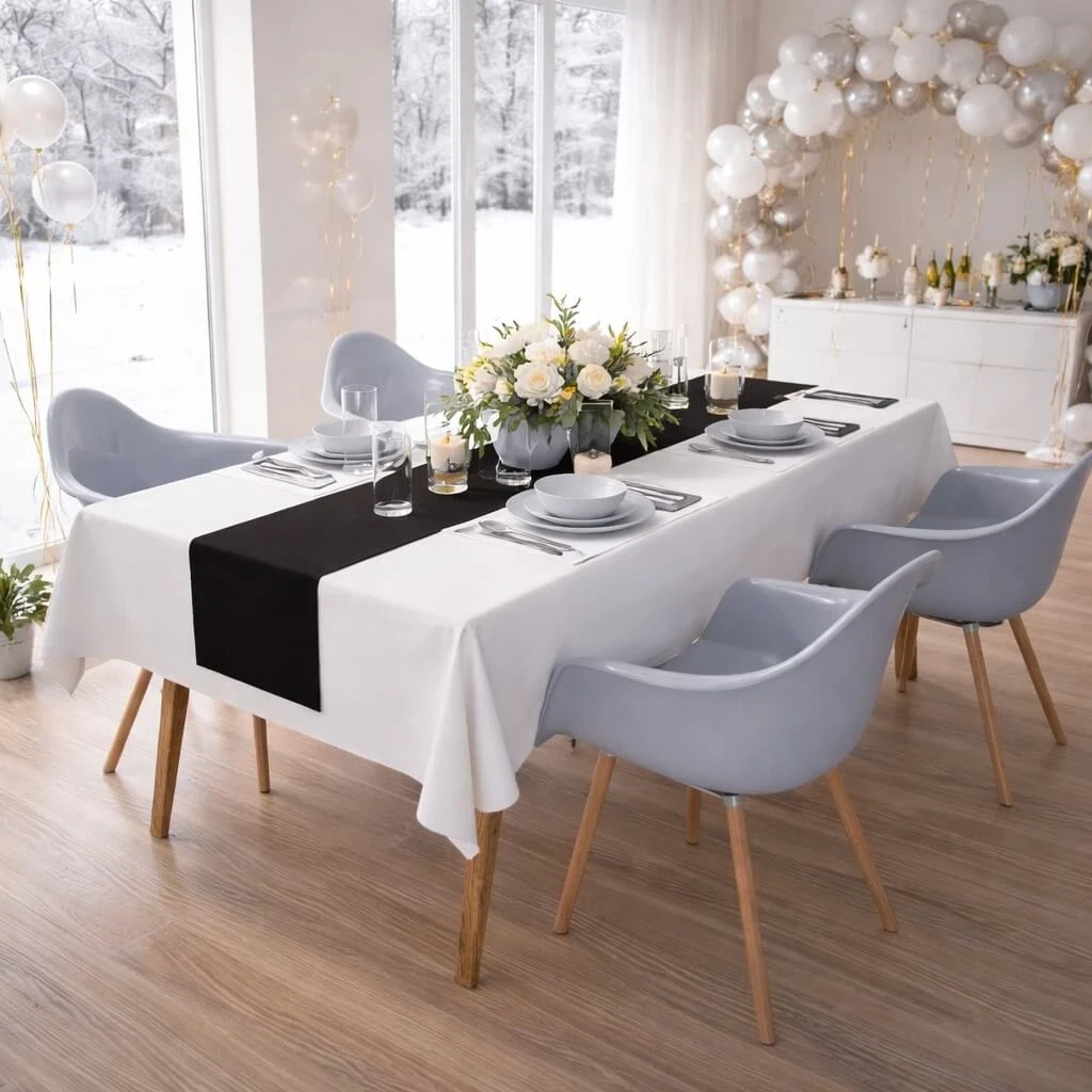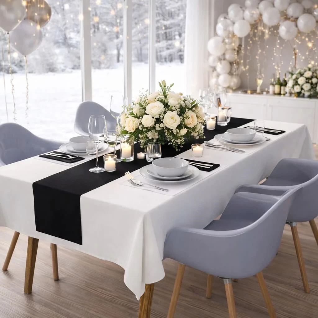 Elegant festbord dækket med hvid Sovie airlaid papirdug, sort bordløber, blomsterdekoration og levende lysElegant pyntet festbord dækket med hvid Sovie airlaid papirdug, sort bordløber, blomsterdekoration og levende lysPyntet festbord dækket med hvid Sovie airlaid papirdug, sort bordløber, blomsterdekoration og levende lys