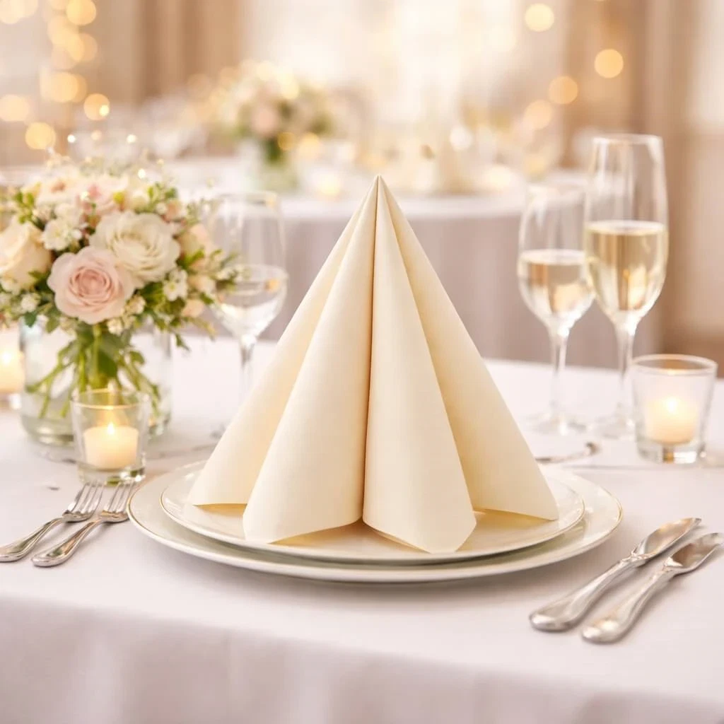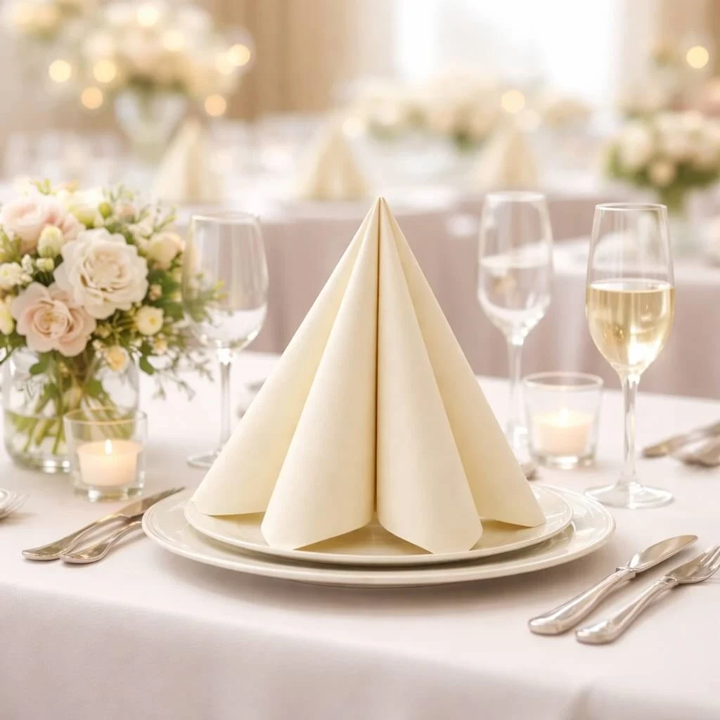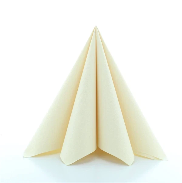 Sovie Linclass Airlaid serviet i creme farve foldet i pyramdeform på hvid baggrund, 40x40 cmElegant opdækket festbord med Sovie Linclass Airlaid serviet i creme foldet i pyramdeform på tallerken, omgivet af blomster, glas og stearinlys.Elegant opdækket festbord med Sovie Linclass Airlaid servietter i creme, blomsterdekorationer, vinglas og stearinlys i lyst festlokale.Sovie Linclass Airlaid serviet i creme foldet elegant på tallerken på pyntet festbord med blomster, stearinlys og vinglas.