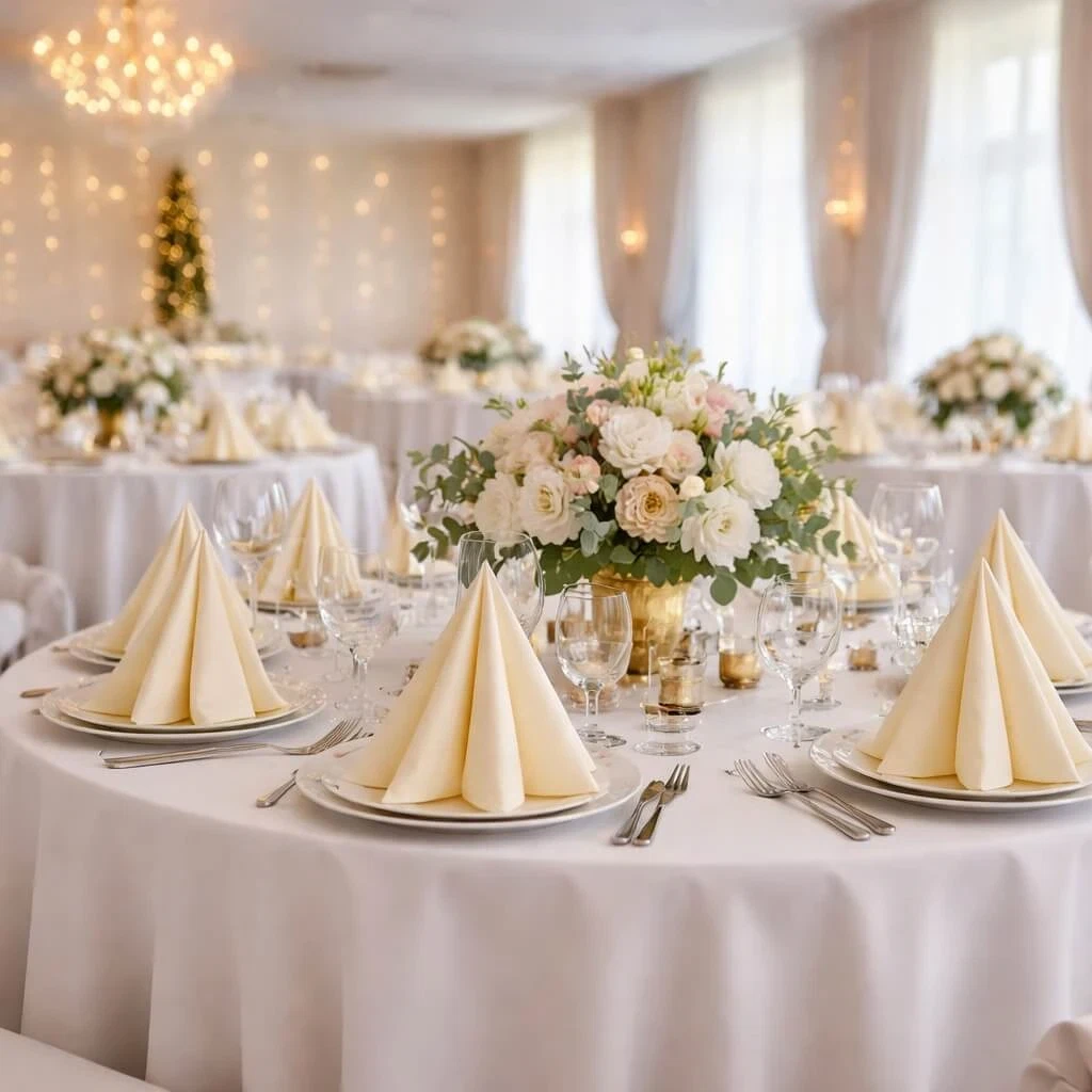 Med en generøs størrelse på 40x40 cm er servietterne velegnede til både formelle middage, bryllupper, konfirmationer, restauranter, caféer og catering. Den neutrale cremefarve passer perfekt til både klassiske og moderne bordopdækninger og kan nemt kombineres med andre farver og dekorationer.