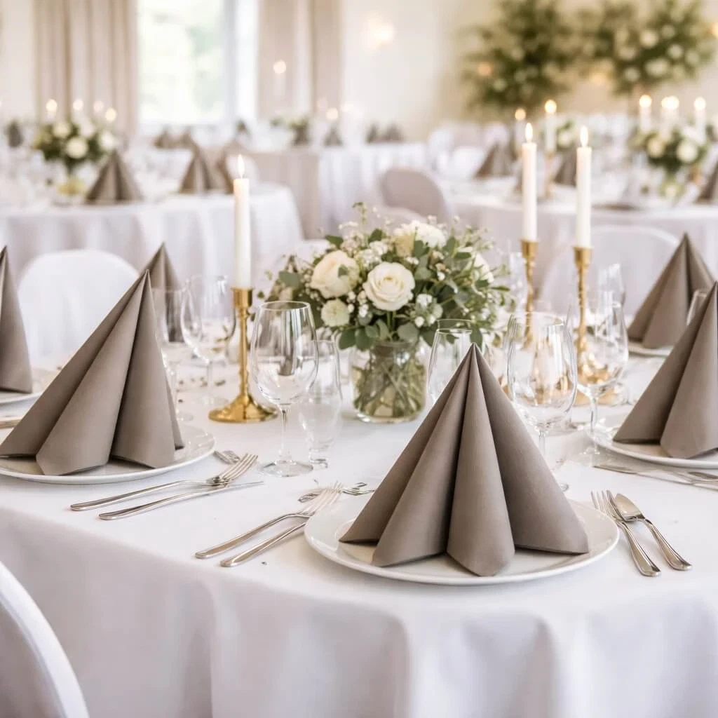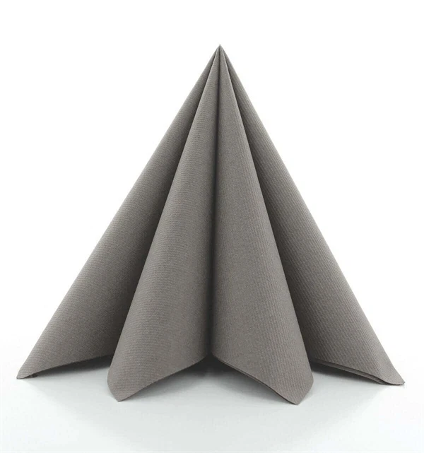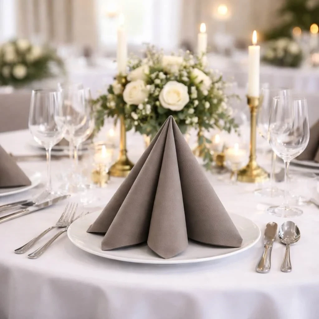 Gråbrun Sovie Linclass airlaid serviet foldet dekorativt i pyramideform 40x40 cmElegant festbord dækket med gråbrun Sovie Linclass airlaid serviet foldet dekorativt på hvid tallerkenPyntet festlokale med runde borde dækket med gråbrune Sovie Linclass airlaid servietter og blomsterdekorationerElegant festbord med gråbrune Sovie Linclass airlaid servietter foldet på hvide tallerkener og blomsterdekorationer