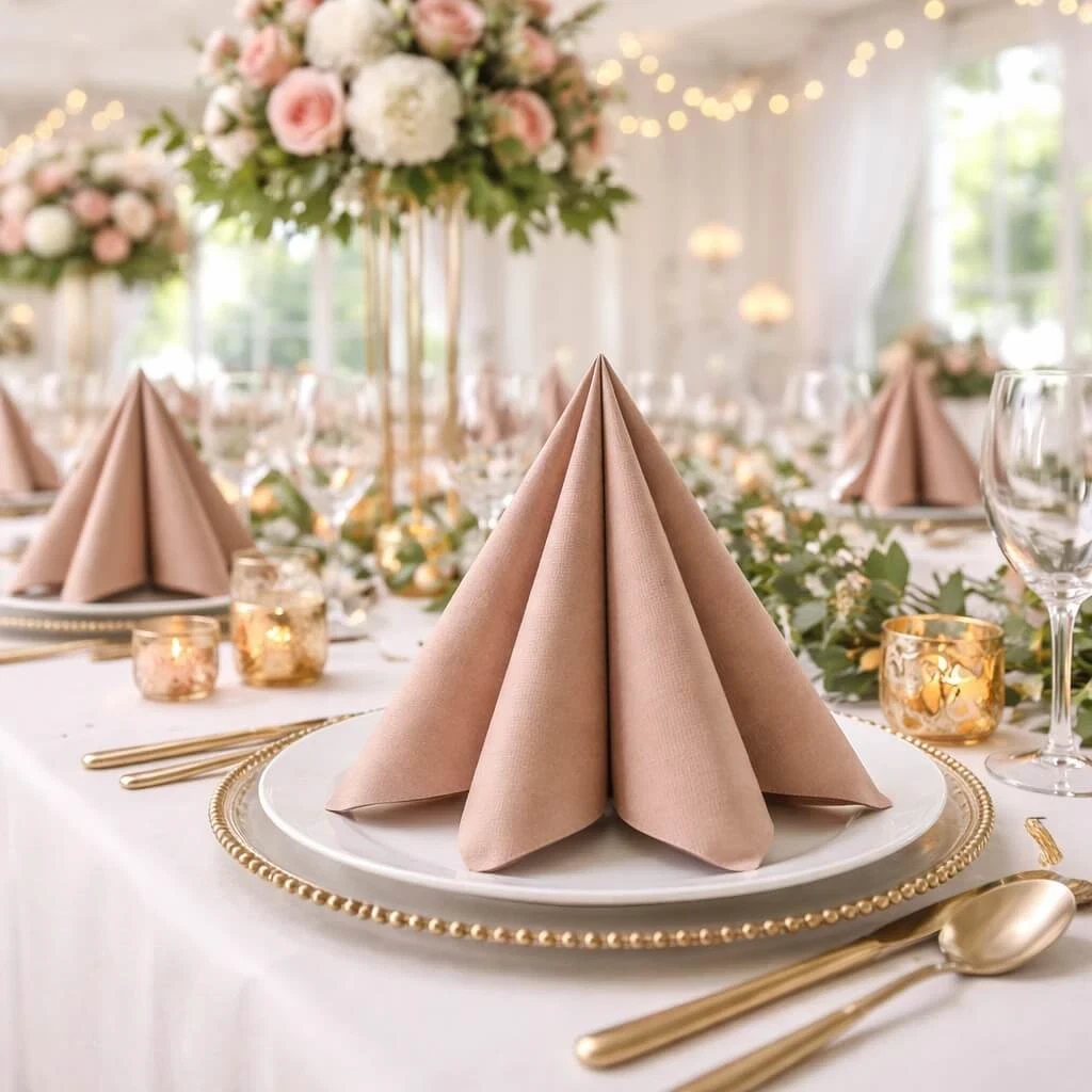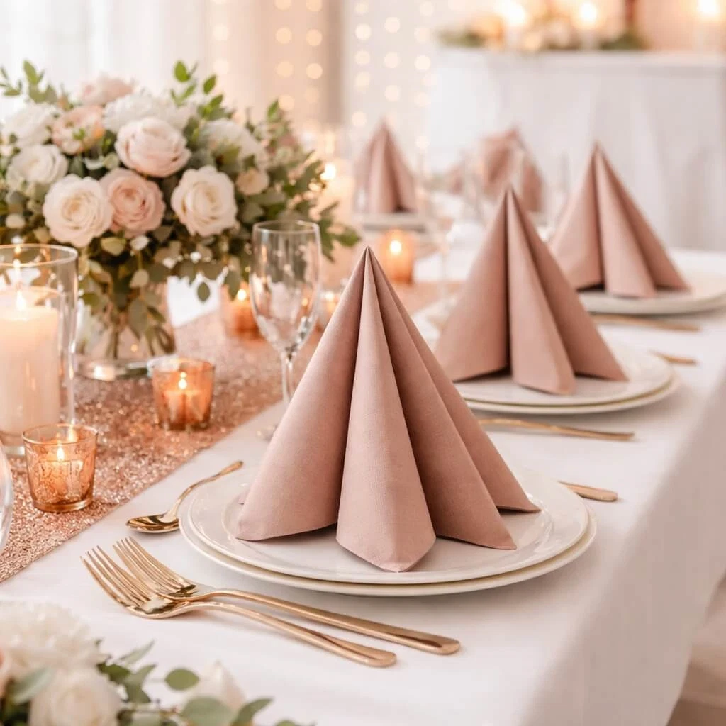Med målene 40×40 cm og en imponerende sugeevne er servietterne både praktiske og dekorative. Den varme rosegold-farve tilfører bordet et moderne og eksklusivt præg og er ideel til alt fra bryllupper, konfirmationer og jubilæer til nytår, fødselsdage og firmaevents.