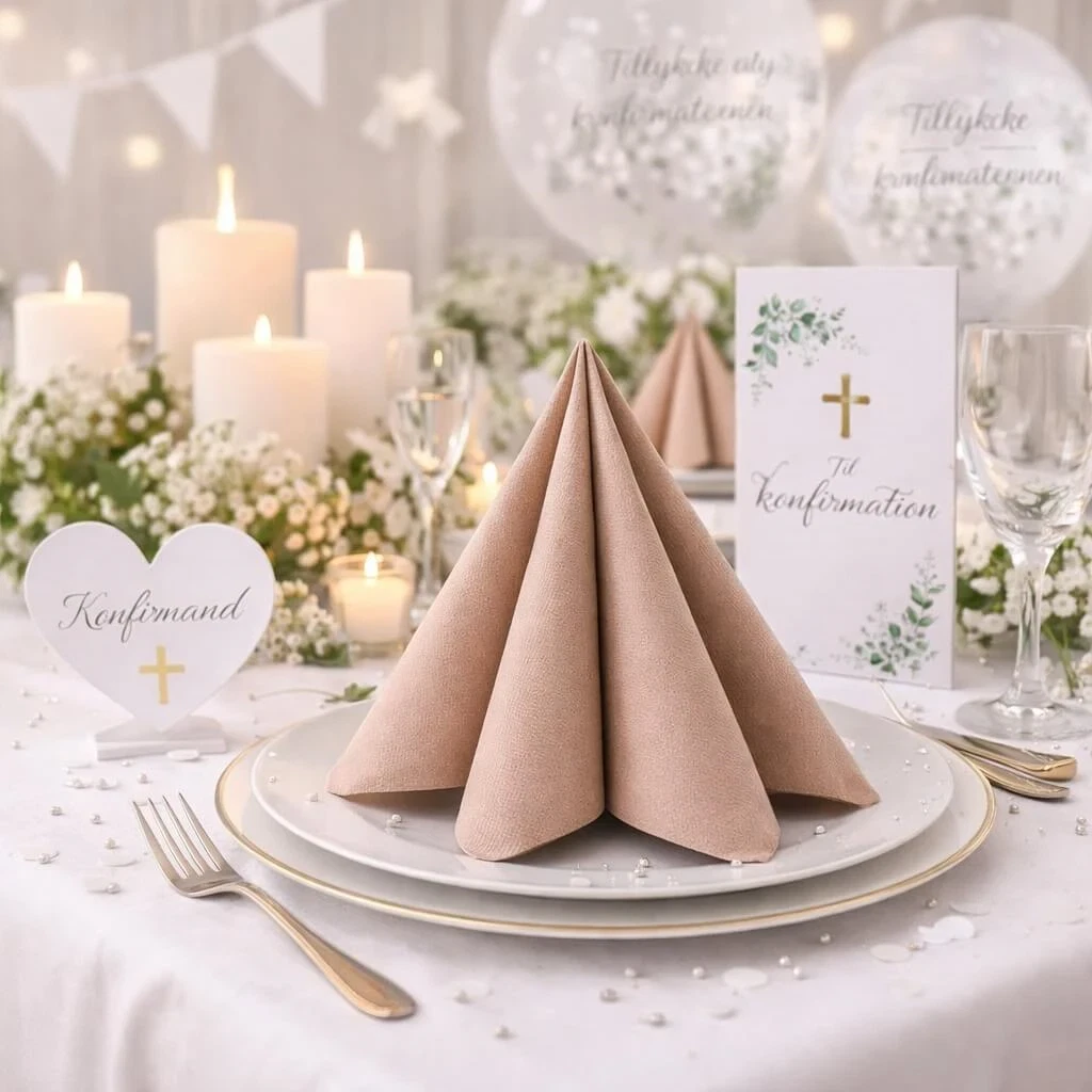Sovie Linclass Airlaid serviet i rosegold foldet dekorativt, 40x40 cm.Rosegold Airlaid servietter foldet elegant på luksuriøst festbord med blomster, lys og guldbestik.Rosegold Airlaid servietter foldet dekorativt på elegant festbord med blomster, stearinlys og guldbestik.Rosegold Airlaid serviet foldet elegant på konfirmationsbord med hvide tallerkener, blomster og stearinlys.
