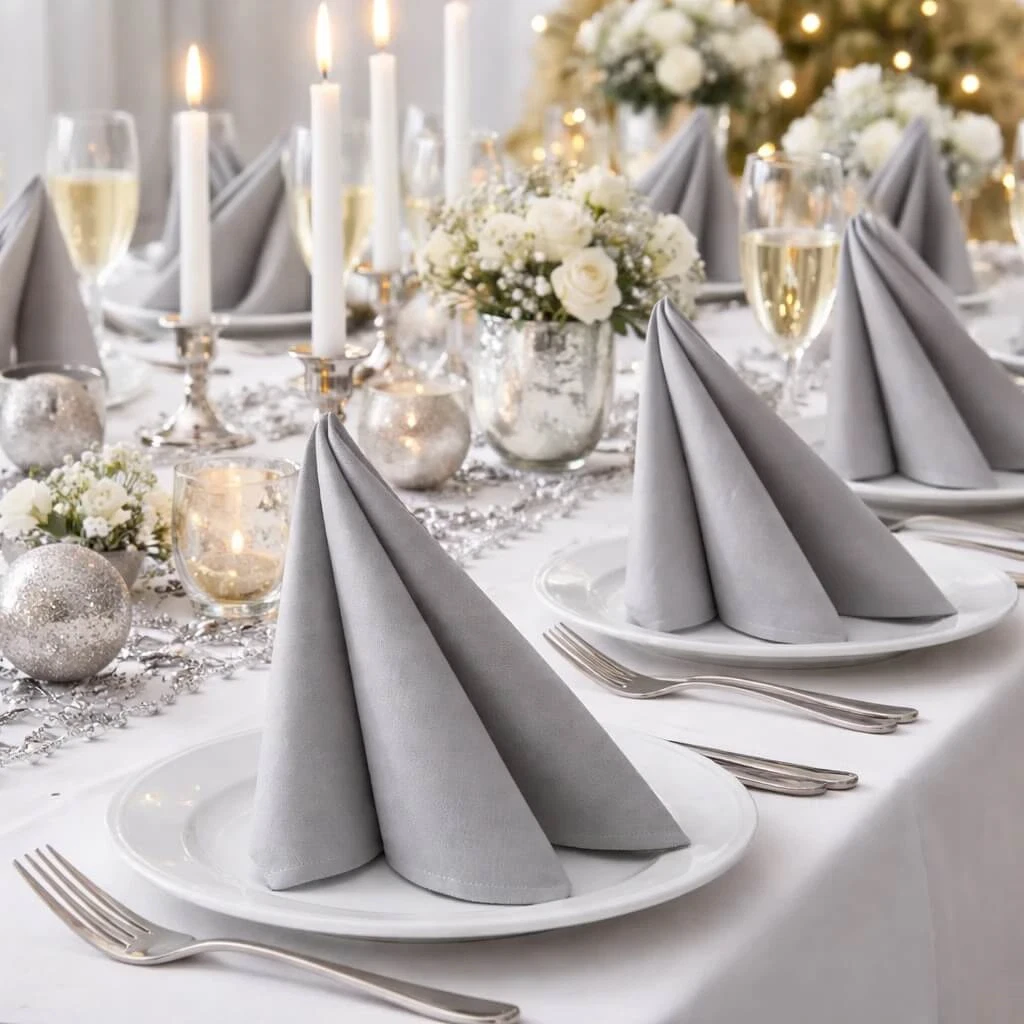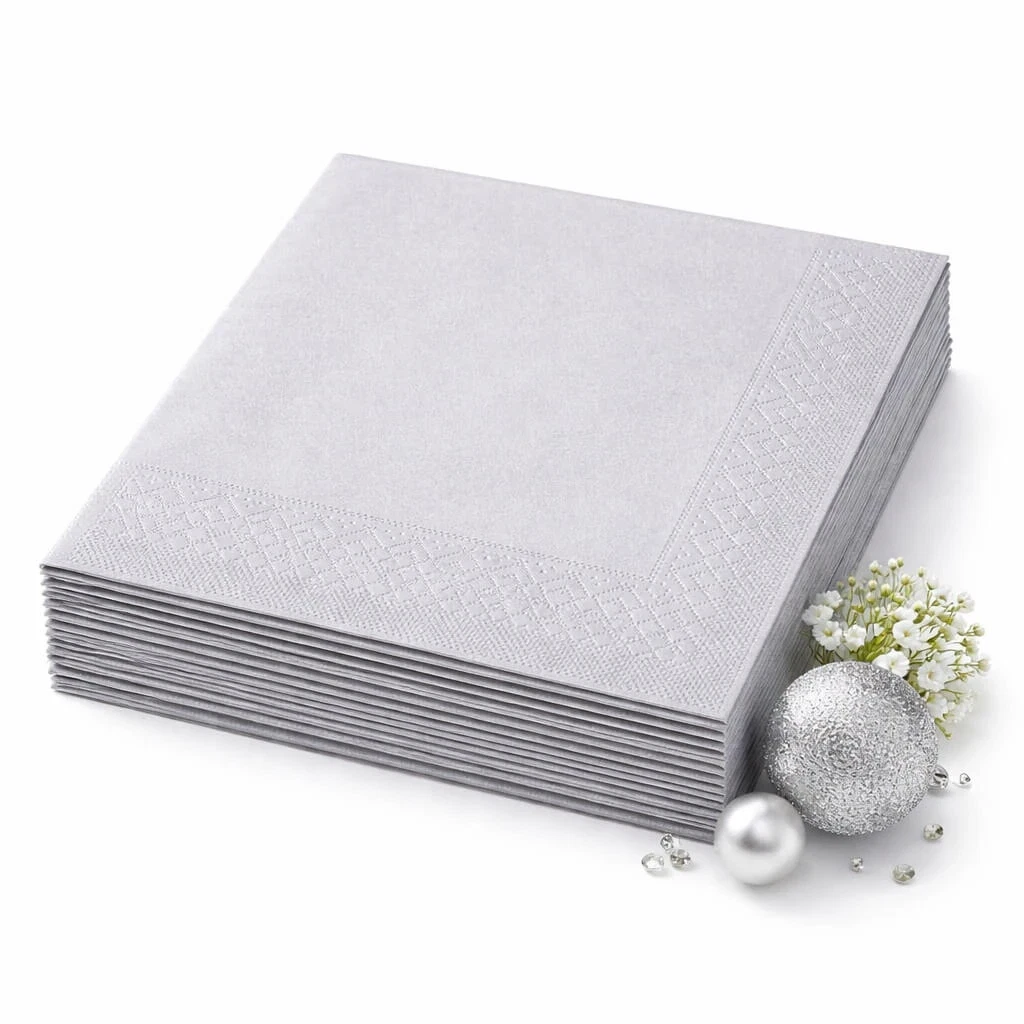 Den sølvfarvede nuance giver et eksklusivt og moderne look, der passer perfekt til bryllupper, nytårsfester, jubilæer, firmaevents og gallamiddage. Servietterne er fremstillet i blødt papir, som både føles behageligt og er let at folde til dekorative servietformer.