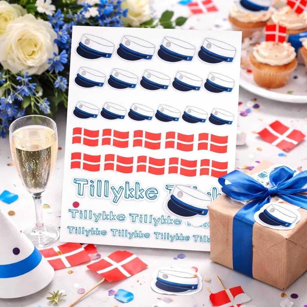 Blå student klistermærker med studenterhuer, danske flag og teksten Tillykke til studenterfestStemningsbillede med Stickers Student Blå brugt på gaver, kort og pynt til studenterfest med blå studenterhuer, danske flag og teksten TillykkeStemningsbillede af Stickers Student Blå brugt på gave, kort og pynt til studenterfest med blå studenterhuer og danske flag