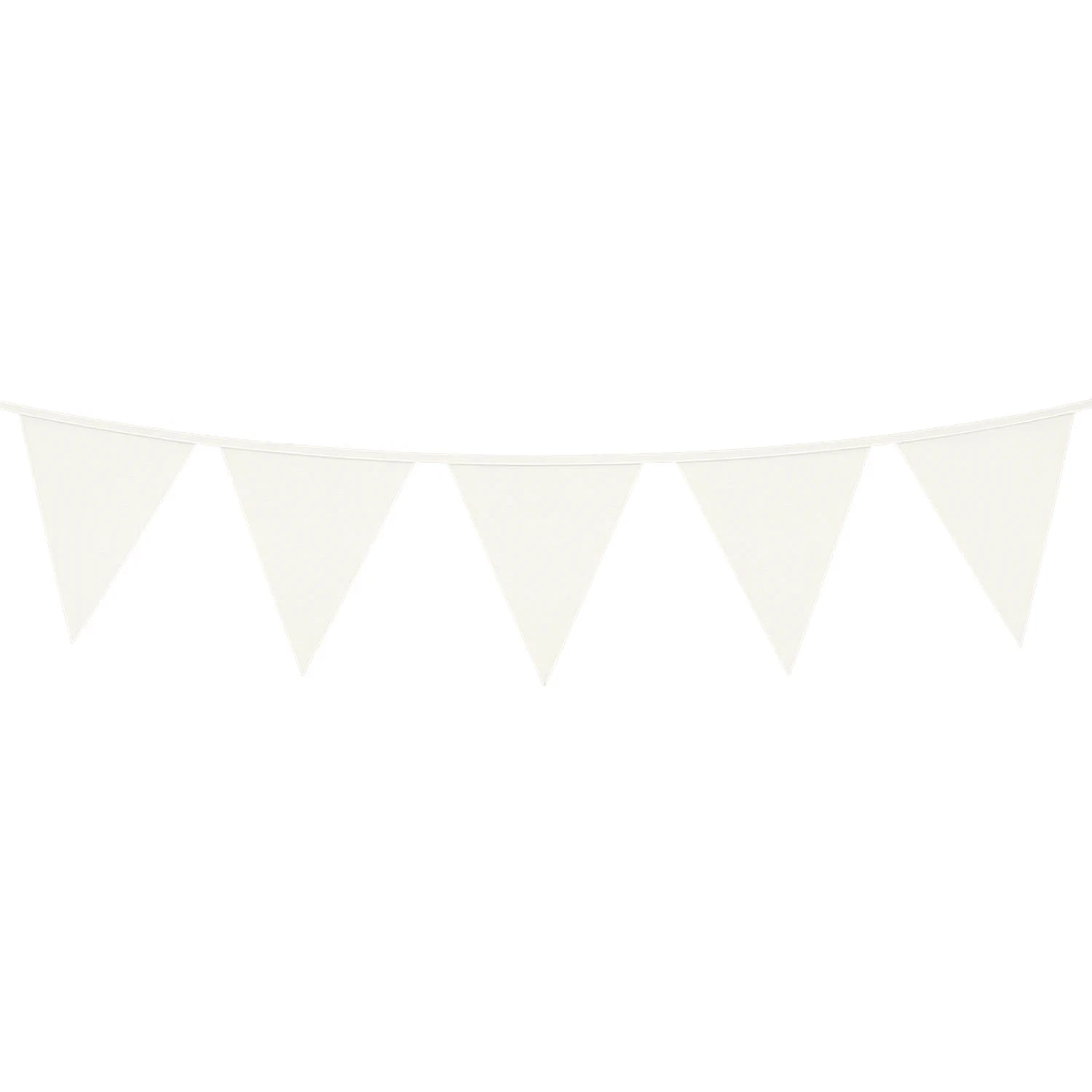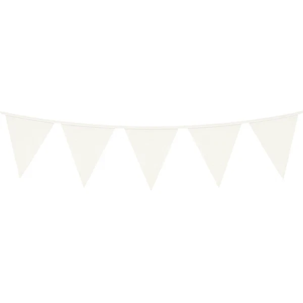 Vimplerne er lavet af hvid plastik, og guirlanden kan derfor bruges udendørs. Den er også mere robust end en guirlande af pap eller papir, så derfor kan du bruge den igen og igen. Måske skal den være fast inventar ved den årlige sommerfest. Sæt den sammen med en lyskæde for en ekstra flot effekt.